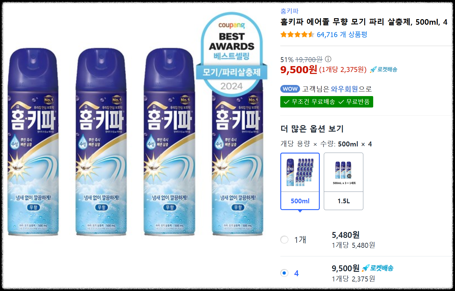 마트에서는 한 개씩 구매할 수 있지만, 쿠팡에서는 **4개 묶음 구성(현재 9,500원, 개당 약 2,375원)**으로 정말 저렴하게 구입할 수 있어요. 특히 4월부터 9월까지 모기 출몰 시즌 내내 사용해야 하는 주택 거주자라면 묶음 구매가 효율적이에요!