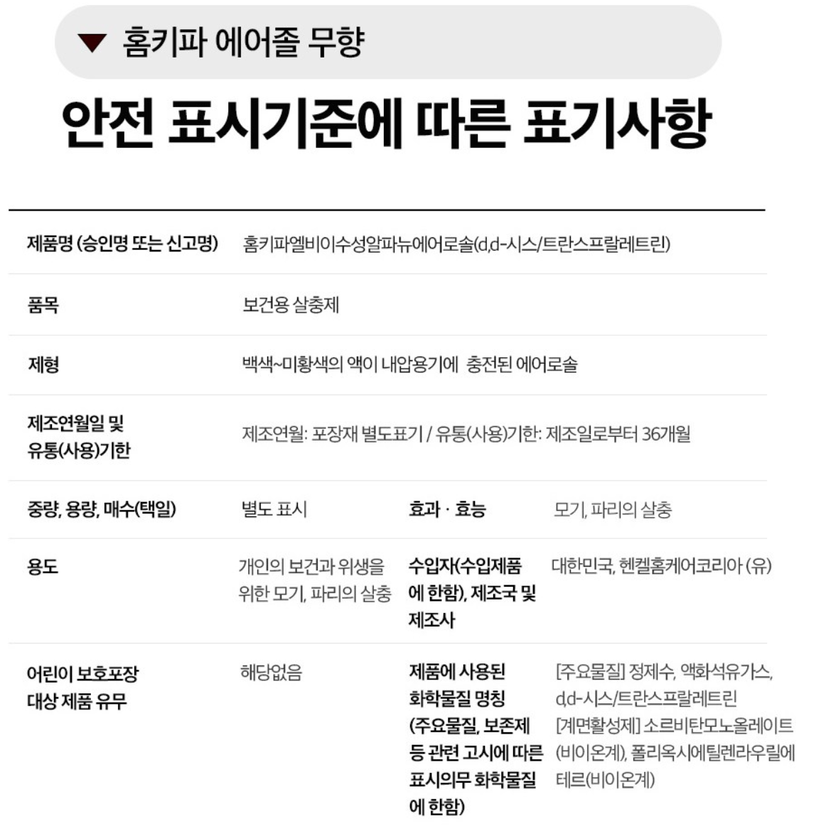 | 사용법 | 사용 전 충분히 흔든 후 0.6m 거리에서 분사, 사용 후 환기 |