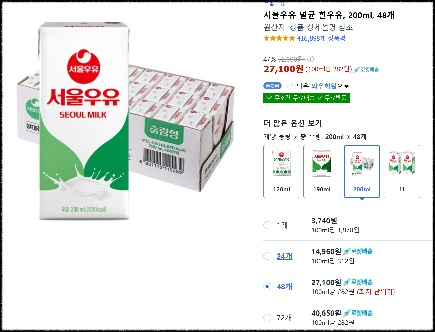 ✔️ 서울우유 멸균 흰우유 200ml 48팩 주요 요약