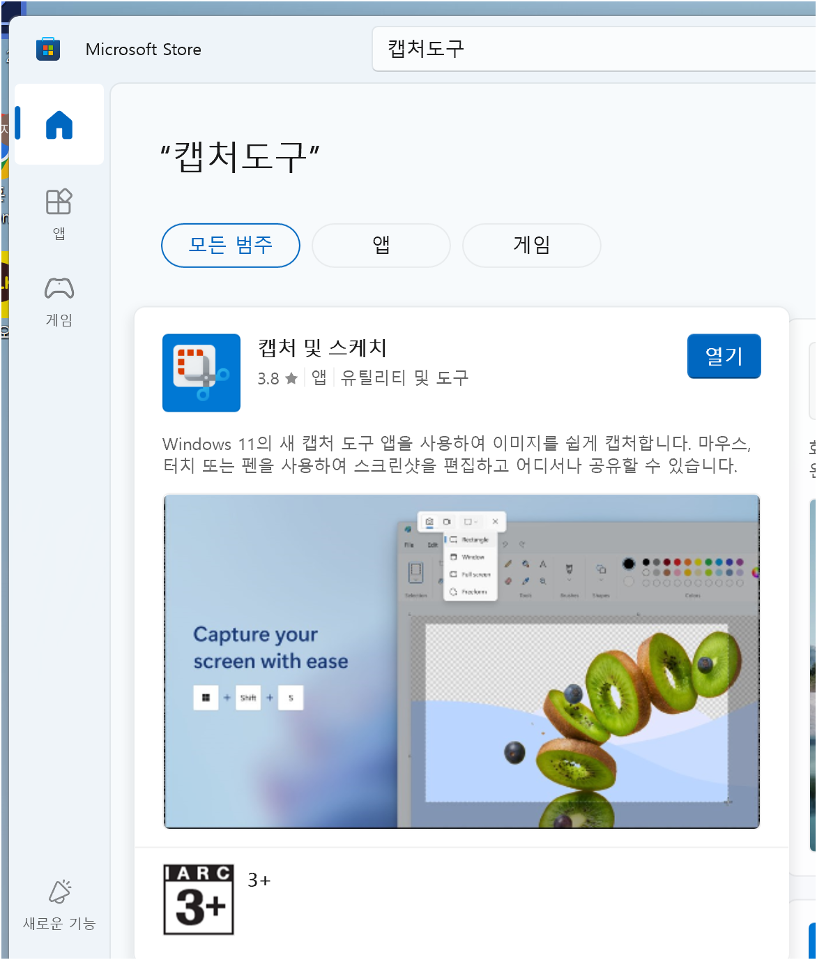 - 검색 결과에서 캡처 도구 앱을 선택하세요.