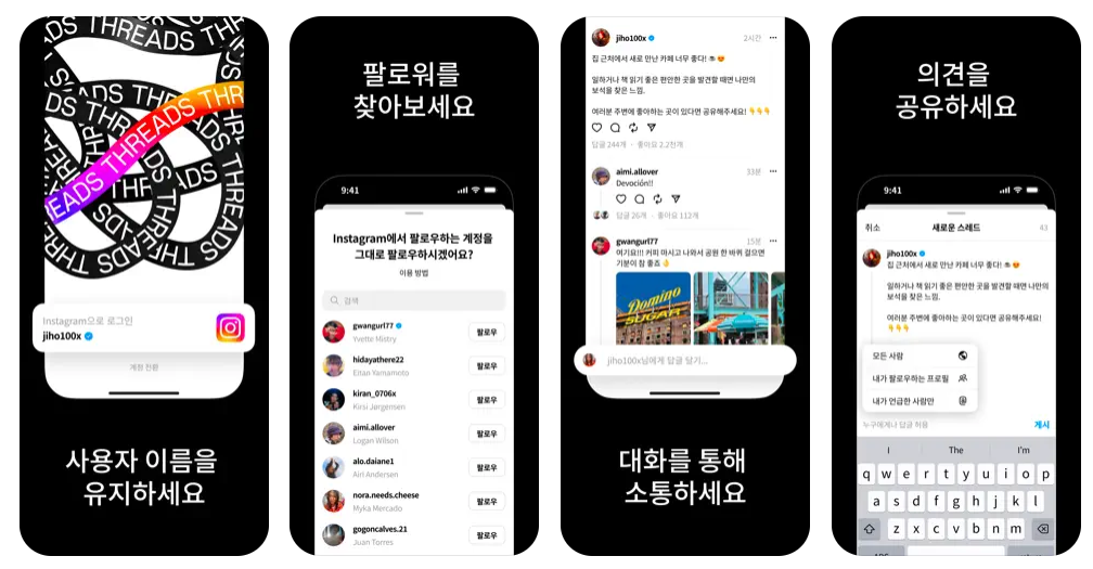 1. 앱 다운로드: 구글 플레이스토어(안드로이드) 또는 애플 앱스토어(iOS)에서 "Threads"를 검색합니다.